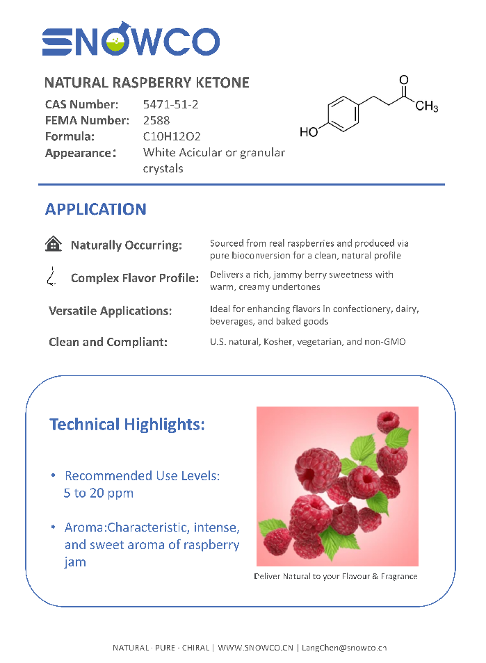 Consumers crave natural and authentic tastes. SNOWCO’s Natural Raspberry Ketone (CAS: 5471-51-2), sourced